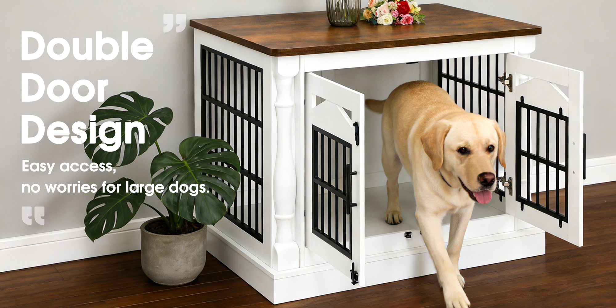 "This dog crate features thick, sturdy steel bars with a sleek design—no more worries about your dog chewing around the house."