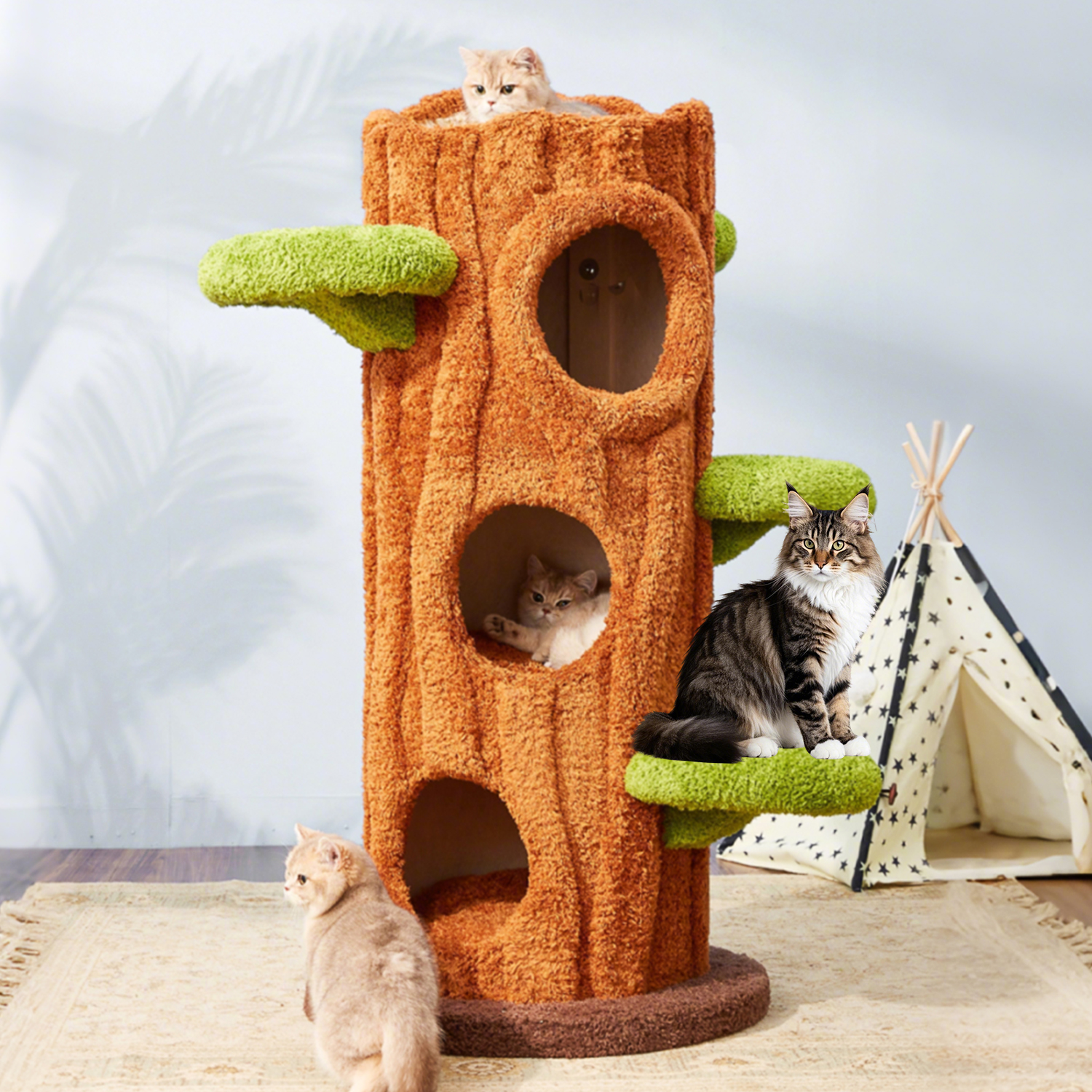 This tree-shaped cat condo is a vertical paradise for your feline friends, featuring a design inspired by nature in brown and green. Made from solid wood, it offers eight tiers and three condos, providing ample space for climbing and lounging. The scratching pad and posts are crafted from natural sisal, perfect for satisfying scratching instincts. At 49'' tall and 24'' wide, it fits seamlessly into your home. Plus, the removable cushions add convenience, making cleaning a snap.