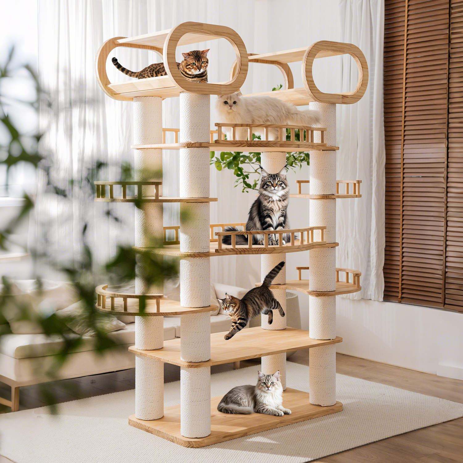 Endless Fun & Exploration: Multi-Level Design: Offers multiple layers for climbing, jumping, and exploring, keeping your cat entertained for hours. Integrated Hammocks & Toys: Features cozy hammocks for relaxation and interactive toys for playtime, catering to your cat’s natural instincts. Built-In Scratcher: Wrapped with natural sisal rope, it satisfies your cat’s scratching needs while protecting your furniture.
